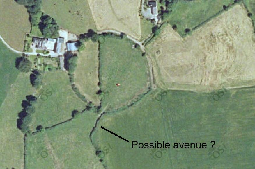 It is one of only two hill-forts located within county Wexford; the other is located at Courthoyle, Adamstown. The Ballybuckley hill-fort measures c. 130m in diameter and is defined by an large earthen bank which survives to between 9m-11m in width and up to 2.2m in height. The interior of the monument is divided by a relatively modern field boundary and there are three entrances, all of which appear to be recent in date. However, an unusual series of field boundaries located on the southwest side of the monument may indicate where the original entrance was located. These field boundaries appear to define an avenue feature that may have been focused on the original gateway (see image below).