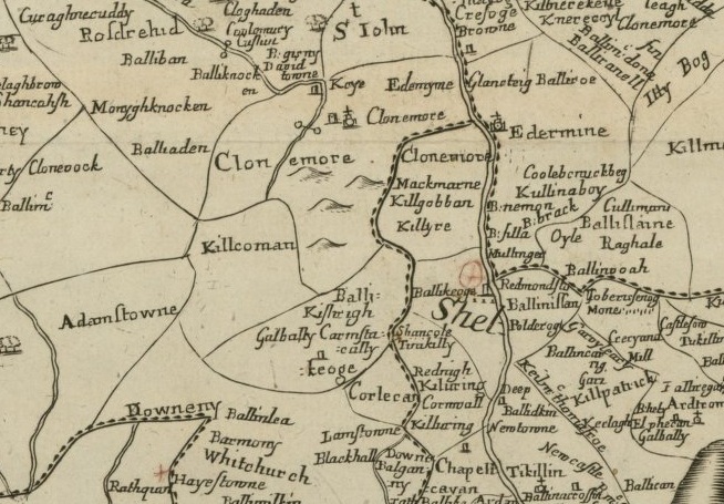 Other buildings illustrated include the church at Clonmore and a mill along the River Boro (two circles joined by a line). Interestingly an number of place-names in the parish are also recorded on this map including