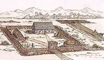 We are lucky that a detailed account for the construction of a moated site survives from Co. Wexford in the account rolls of the manor of Old Ross. It describes how, in the years 1282-3 and 1283-4, 66 perches of moat were dug around the haggard or farmstead of Ballyconner (Mylerspark, Co. Wexford; see Colfer 1996). The most expensive item described during the build was the wooden palisade, which cost over £10 to construct. The stakes for the palisade were fashioned out of tree trunks, which were sharpened and then driven into a foundation trench. It was obviously a substantial structure as a total of 18 carpenters and their assistants were involved in its build. One of these workers was referred to as Thomas the Ditcher and this man was probably also employed in constructing the surrounding moat, which cost over £3 to excavate. The rolls also describe the construction of a gate for the site which cost 8/6d for build and carriage. The cost of transporting the gate to the site was particularly expensive (5/3d) leading Dr Terry Barry to suggest that it may have been a very substantial affair, perhaps even a gate tower (Barry 1977, 10). Possible evidence for just such a structure was recently uncovered at a moated site at Coolamurry, Davidstown, where the remains of what may have been a wooden gate tower and an associated drawbridge were found (Fagan 2005).