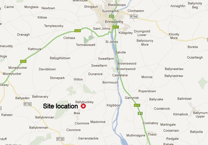 In 2007 the parish’s first archaeological investigation was carried out at Ballybuckley, Bree (see site location map at the bottom). It revealed evidence of medieval activity, possibly representing a farmstead, in the southern part of the townland, close to the Knockduff lane. This archaeological work was carried out in advance of a proposed quarry development (since stopped) and it took the form of a geophysical survey and subsequent test-trenching (more information can be found here). A geophysical survey is a form of ground penetrating radar that allows archaeologists to see features hidden below the topsoil. At Ballybuckley the survey identified a number of geophysical anomalies (potential archaeological features) and these were subsequently investigated by opening test-trenches across them.